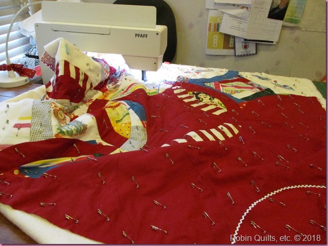 The quilting has begun. Have you ever seen so many pins?